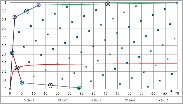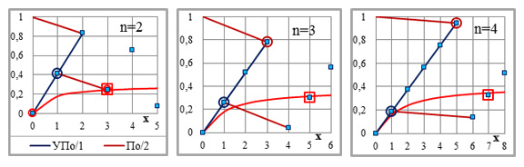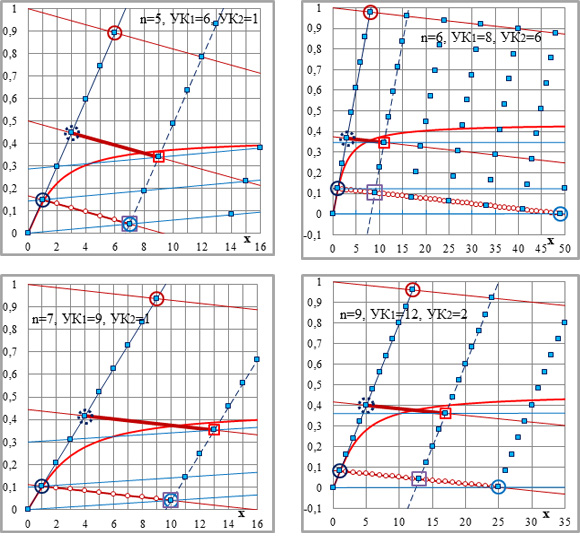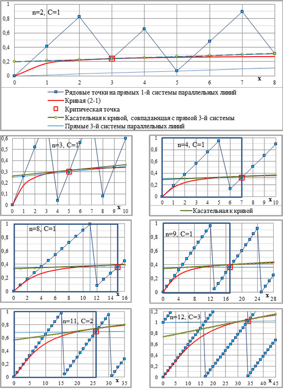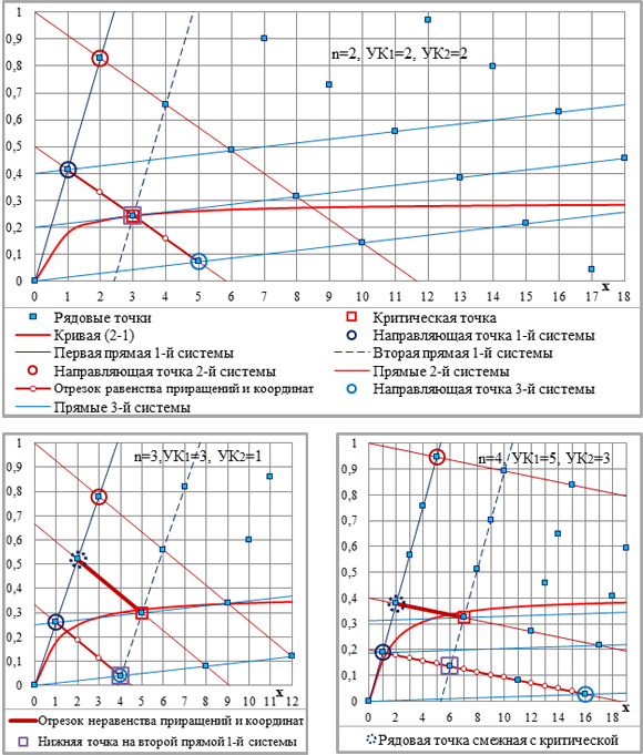 Рис.2-1. Основные параметры графической схемы – кривая (2-1), критическая точка, рядовые и направляющие точки и укрупнённые приращения ординат (УПО). Сверху вниз: n=2, n=3 и n=4; С=1. Легенда – на всех графиках, фрагменты графиков – см. рис.2-2 на следующей странице.