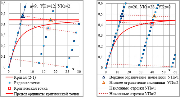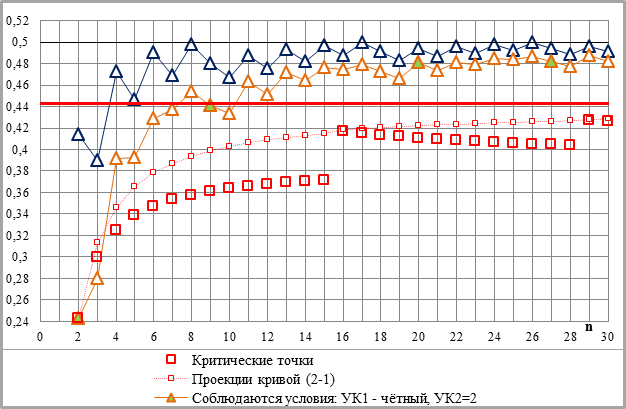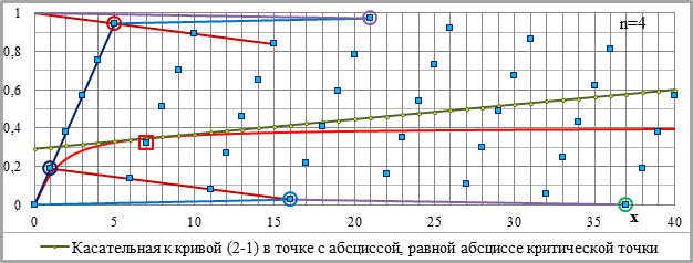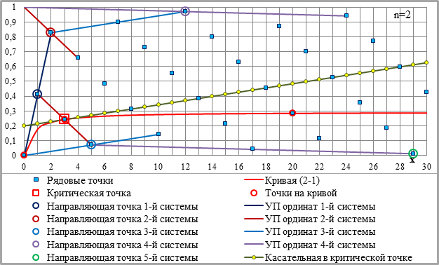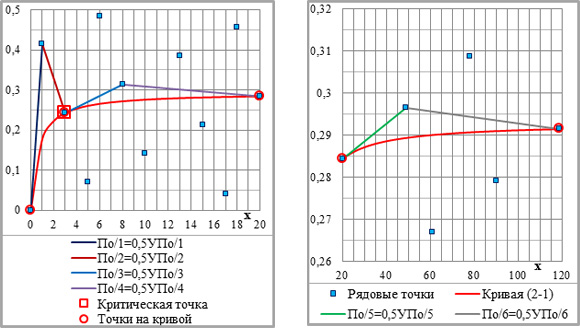 Рис.4-7-1. Положение критической точки вне кривой (2-1) – при наличии других точек, лежащих на ней (легенда – на трёх первых графиках); n=2.