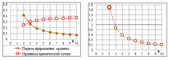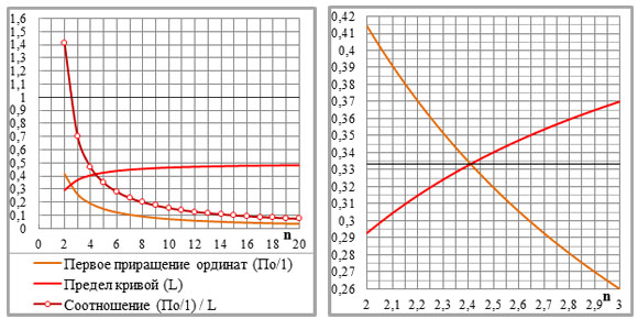 Каждому показателю степени соответствует бесконечный график кривой с параметрами табл.2-1. Высокой степенью упорядоченности все параметры резко выделяются при n=2, – из-за постоянства отношений соседних приращений ординат.