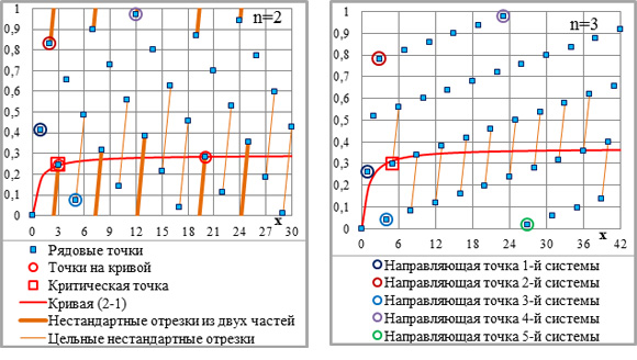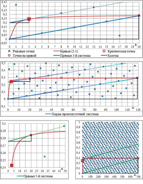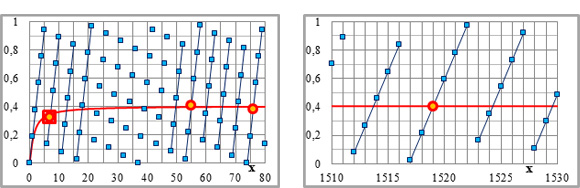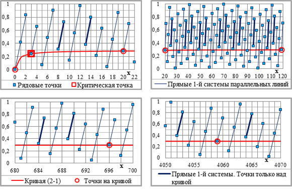 Рядовые точки образуют бесконечное множество систем параллельных линий. На графиках (рис.2-1)1) прослеживаются только первые из них – с наиболее крутыми линиями. Большинство систем с пологими линиями не видны из-за больших расстояний между точками по горизонтали и ограниченной – реальной – длины графика.