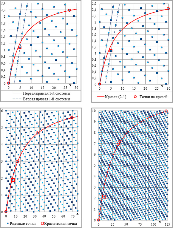 Главными графическими элементами однотипных – для каждого показателя степени – схем служат кривая и множество точек. Формула кривой и координаты точек сконструированы таким образом (см. раздел 2), что совместимость двух названных элементов графика свидетельствует о целочисленном решении радикала, несовместимость – о дробном иррациональном результате.