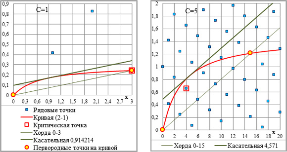 Рис.4-7-2. Воспроизводство точек в ЗНН. Левый график – С=1, правый – С=5. Легенда – на обоих графиках; цифры при касательных и хордах – абсциссы точек пересечения и касания [кроме обозначения кривой – (2-1)]; 0,914214=0,5+[(v2)–1], 4,5711=5*{0,5+[(v2)–1]}