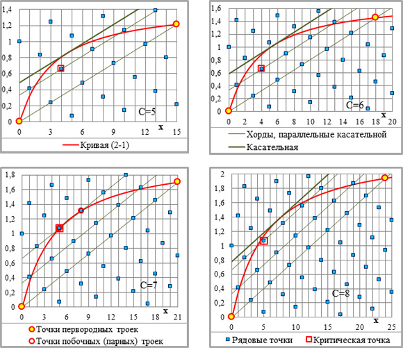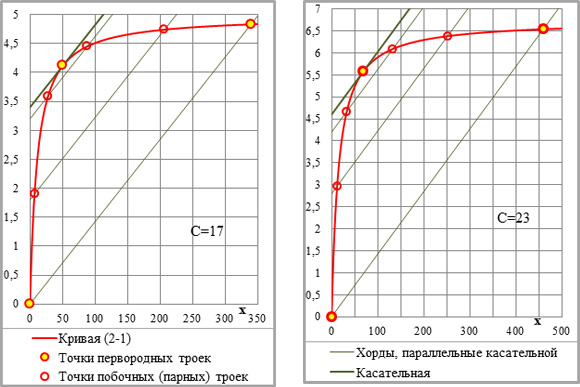Компьютерная программа Microsoft Excel предоставляет широкие возможности для поиска параметров С, обеспечивающих генерацию побочных (парных) троек. Другим способом служит совместное решение уравнений двух линий – кривой (2-1) и секущей её хорды: