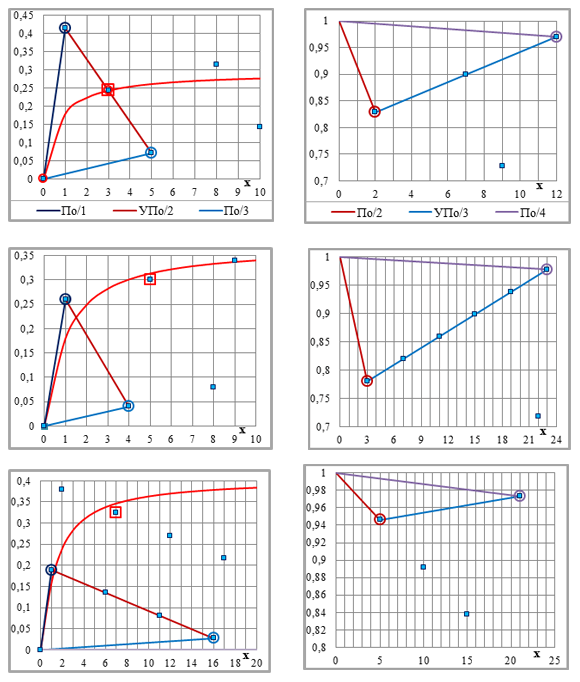 ПО/3=ПО/1–УК2*ПО/2 (графики слева) и ПО/4=ПО/2–УК3*ПО/3 (графики справа)