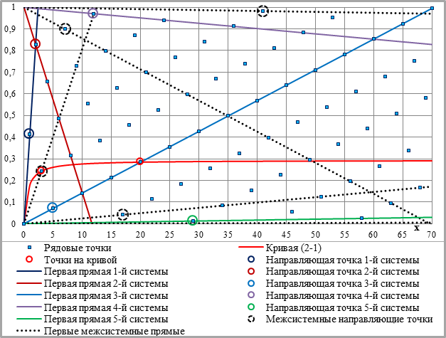 Каждая система параллельных линий включает первую прямую. Первая восходящая прямая (по отношению к кривой – нулевая хорда) начинается в начале координат, нисходящая – в точке с координатами (0; 1). Первые точки на первых прямых названы направляющими (рис.2-1, 2-2); их координаты определяют стандартные для каждого показателя степени приращения абсцисс и ординат (ПА/i; ПО/i). Последние, в свою очередь, определяют угловые коэффициенты параллельных линий каждой системы: tg?i=ПО/i/ПА/i. Все направляющие точки входят в подмножество точек, ближайших к горизонтальным ограничениям элементарного графика; их ординаты могут рассчитываться как по (2-2), так и по формулам графы 2 табл.2-1.